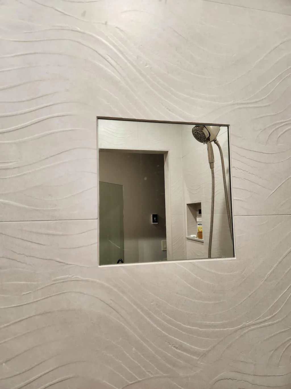 Mirror base mounts on tile surround with 3M Dual Lock.
